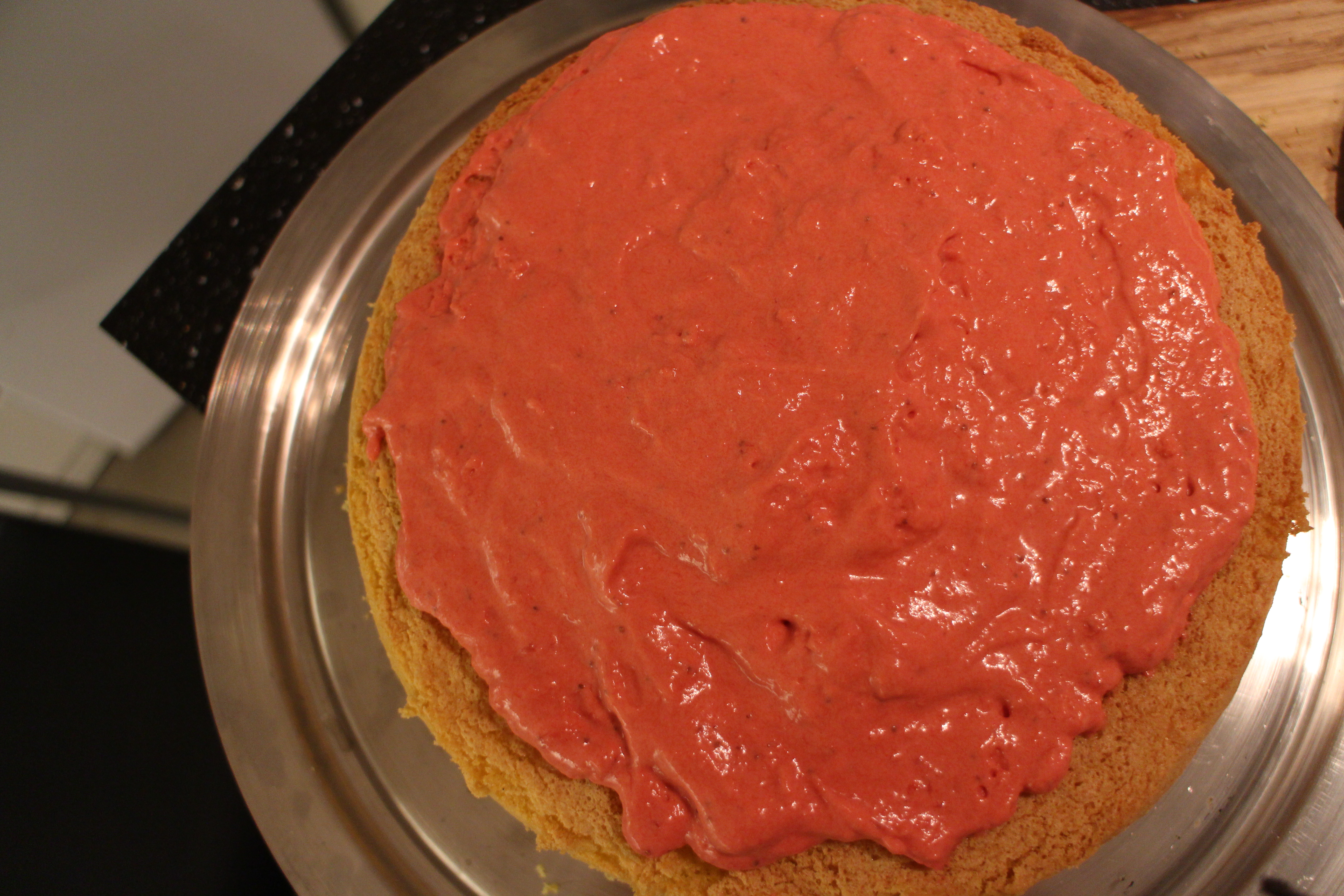 Når sjokoladekremen er satt kjølig er det bare å starte med jordbærfromasjen. Oppskriften er hentet fra bloggen Min hverdagskos, men jeg har justert den noe for å få fram en sterkere jordbærsmak. Ha vann og jordbær i en kjele og kok til jordbærene er myke. Mens dette står på klipper du opp marshallows til mindre biter. Jeg brukte standard sweetfire, og delte hver marshmallow i fire. Bløt også opp gelatinplatene. Når jordbærene er myke kjører du dem med stavmikser eller i en blender til du får en jevn puré. Ha i marshmallowsen og gelatinen og rør til alt er én masse uten klumper. Jeg har også valgt å ha i litt rød konditorfarge (Wilton red-red) for at kaka skal se enda litt friskere ut.
