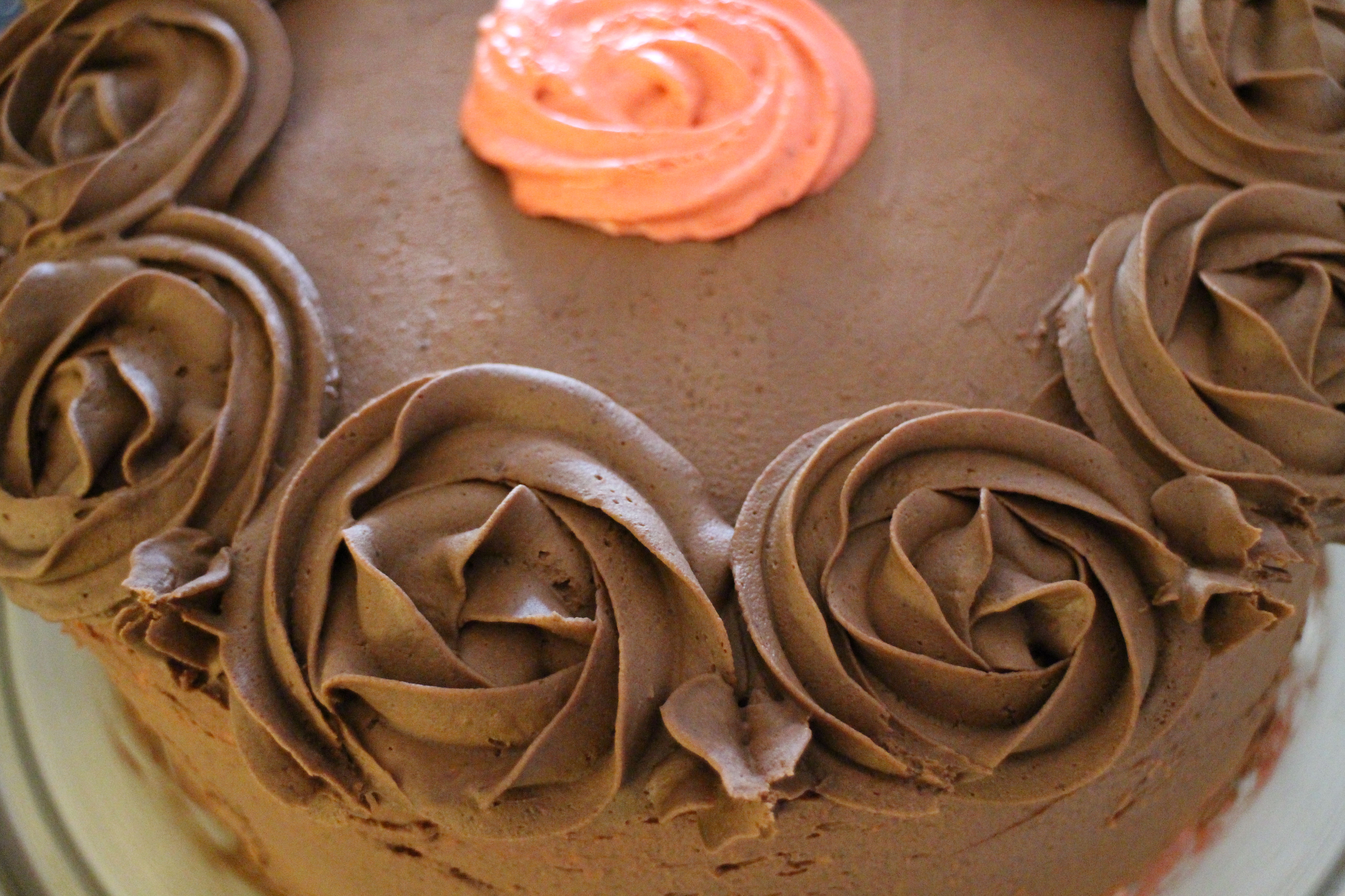 Så legger du på den tredje og siste kakebunnen med den glatte siden opp, og trykk lett ned slik at fyllet setter seg som det skal. Kaka er nå montert og klar for pynting. Smør sjokoladekrem jevnt over hele kaken. Her lønner det seg å starte nederst. Pass på å dytte kremen inn i alle ujevnheter i kaka slik at du får et rett resultat. På toppen av kaka starter du med å legge kremen midt på og sprer den gradvis og forsiktig utover. Jeg har så valgt å legge på noen rose swirls rundt kanten.